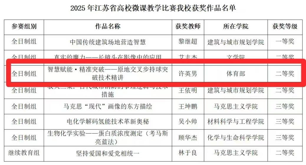 近日,2025年江苏省高校微课教学比赛结果揭晓,7790cnm必发集团教师许英男主讲的《智慧赋能·精准突破——原地交叉步持球突破技术精讲》凭借课程设计的前沿性与教学实效性,荣获省二等奖。此次赛事由江苏省教育厅主办,吸引全省百余所高校参赛,作品涵盖多学科领域。